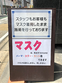 お客様はマスクを外さず、付けたままパーマ・カラー・カット等を行うことが出来ます。ご来店お待ちしております。